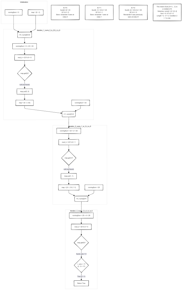 If the sum of elements from index 0 to i (let’s call it sum_i) and the sum of elements from index 0 to j (let’s call it sum_j), where j > i, have the same remainder when divided by k, then the sum of the subarray from i+1 to j must be a multiple of k.